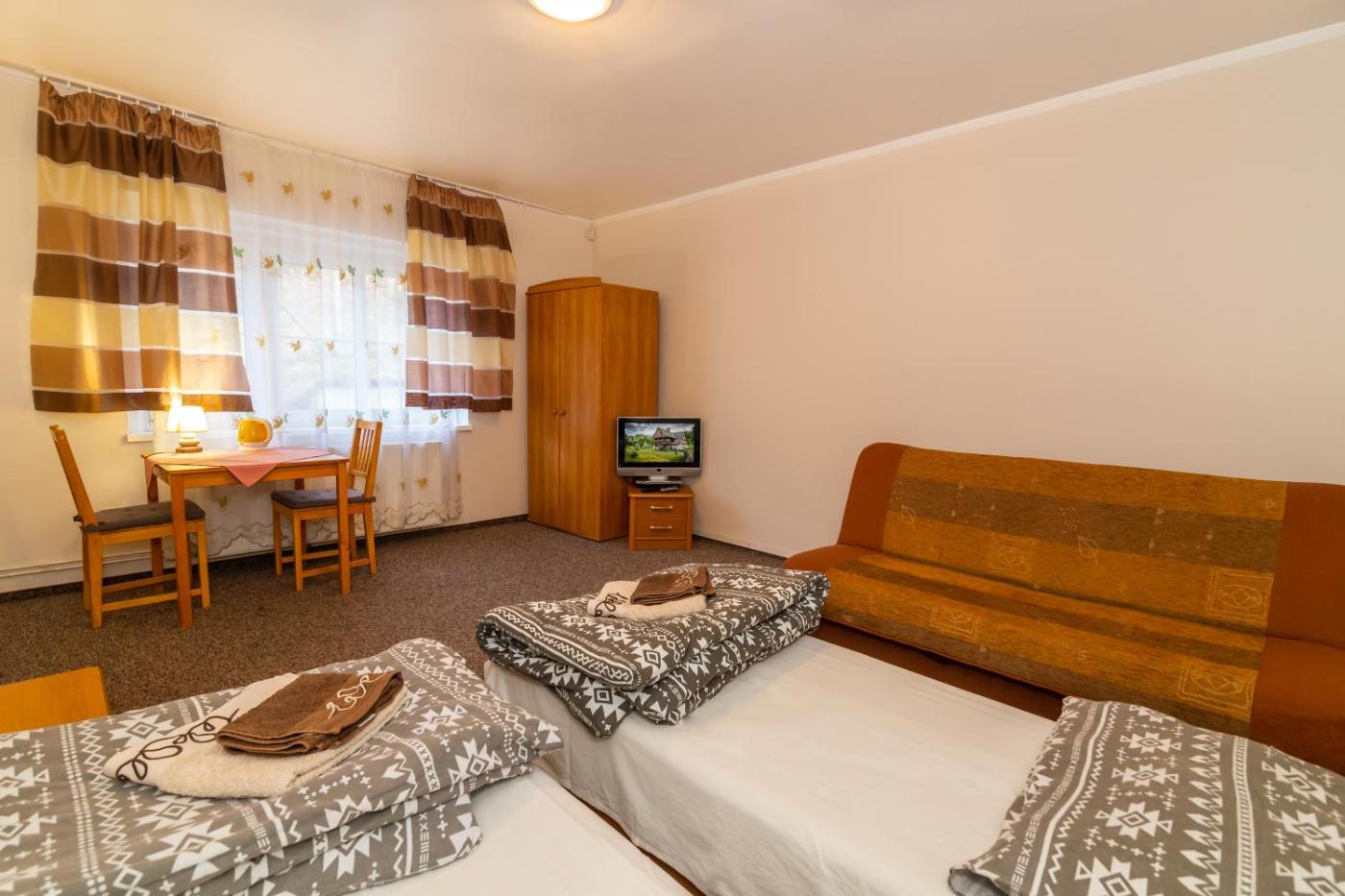 Pokój rodzinny. The family room features a tea and coffee maker and a carpeted floor, as well as a private bathroom boasting a shower. This family room offers heating and a flat-screen TV. The unit has 5 beds. Rodzinny - 5 osobowy. Powierzchnia pokoju ok.: 16 mkw.
