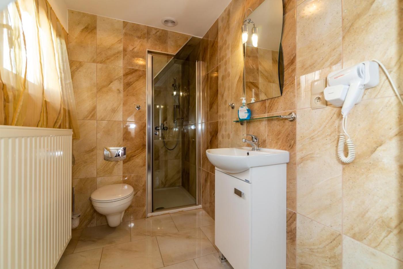 Pokój trzyosobowy z łazienką. The triple room provides a tea and coffee maker, a carpeted floor, as well as a private bathroom featuring a shower. This triple room offers heating and a flat-screen TV. The unit offers 2 beds. Pokój Trzyosobowy - 3 osobowy. Powierzchnia pokoju ok.: 13 mkw. ;